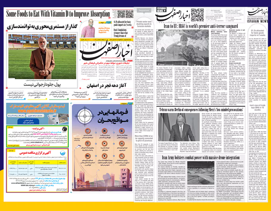 ثبت افتخار تاریخی برای تئاتر اصفهان جذب بیش از ۴۵۰۰ میلیارد تومان سرمایهگذاری جدید به میزبانی ۳۰۰ بقعه متبرکه اصفهان صرفهجویی ۸ میلیون مترمکعبی آب صادرات یک میلیارد دلاری فولاد مبارکه، پشتوانه اقتصاد ایران در سال پرچالش اصفهانیها در دوحه به مصاف حریف قطری میروند دانشگاه صنعتی اصفهان، نماد خودباوری و مرجعیت علمی است اولویت بانک تجارت حمایت تمامقد از پروژههای پیشران کشور