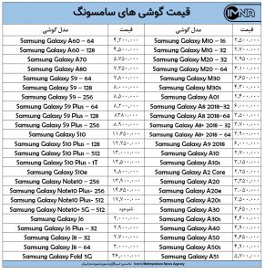 قیمت انواع تلفنهای همراه برند “سامسونگ” در بازار امروز پنج شنبه _۱۱ اردیبهشتماه_ به شرح زیر است: