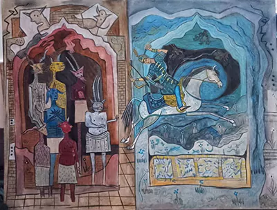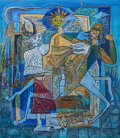 در نگاه نخست، فرمها و پیکرهها به یاد نقشمایههای کهن میافتند؛ چهرههایی که گویی از دل شاهنامه و اسطوره برخاستهاند و در عین حال، درگیر روایتی مدرناند. ترکیب رنگها، از آبیهای ژرف تا طلاییهای درخشان، میان گذشته و اکنون پل میزنند. پیکرهای نیمهانسان، نیمهجانور، با اندامهای گسسته و خطوط روان، ما را به جهانی میبرند که مرز میان انسان و اسطوره در آن فرو ریخته است.