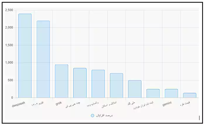 الف ) هوش مصنوعی و فناوری ۴۰ درصد از مجموع جستجوها را از آن خود کرده که شامل deepseek ۲۴۰۰٪، grok ۹۵۰٪، چت جی پی تی ۸۵۰٪، و gemini ۲۵۰٪ است. این دسته بیشترین رشد را نشان میدهد و بازتاب انقلاب جهانی AI در سال ۲۰۲۵ است. برای مثال، Gemini در سطح جهانی نیز در صدر جستوجوها قرار گرفت، که نشاندهنده ادغام آن در ابزارهای گوگل مانند جستوجو و اندروید است. این رشد میتواند ناشی از استفاده آموزشی و حرفهای باشد، مانند برنامهنویسی و تولید محتوا، که در شرایط اقتصادی سخت، به عنوان ابزاری برای درآمدزایی دیده میشود.